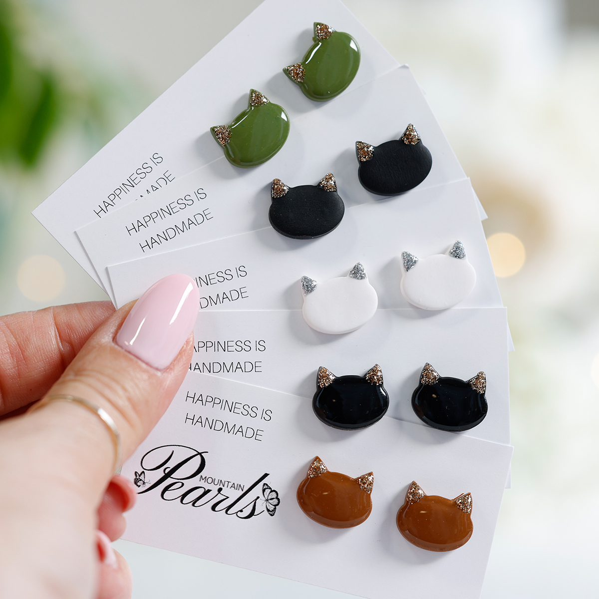 Simpatični neviseči uhani mucke so večje velikosti, izdelane so iz polimerne gline, nekateri modeli so prekriti z umetno smolo. Na ušeskih so dodane bleščice.