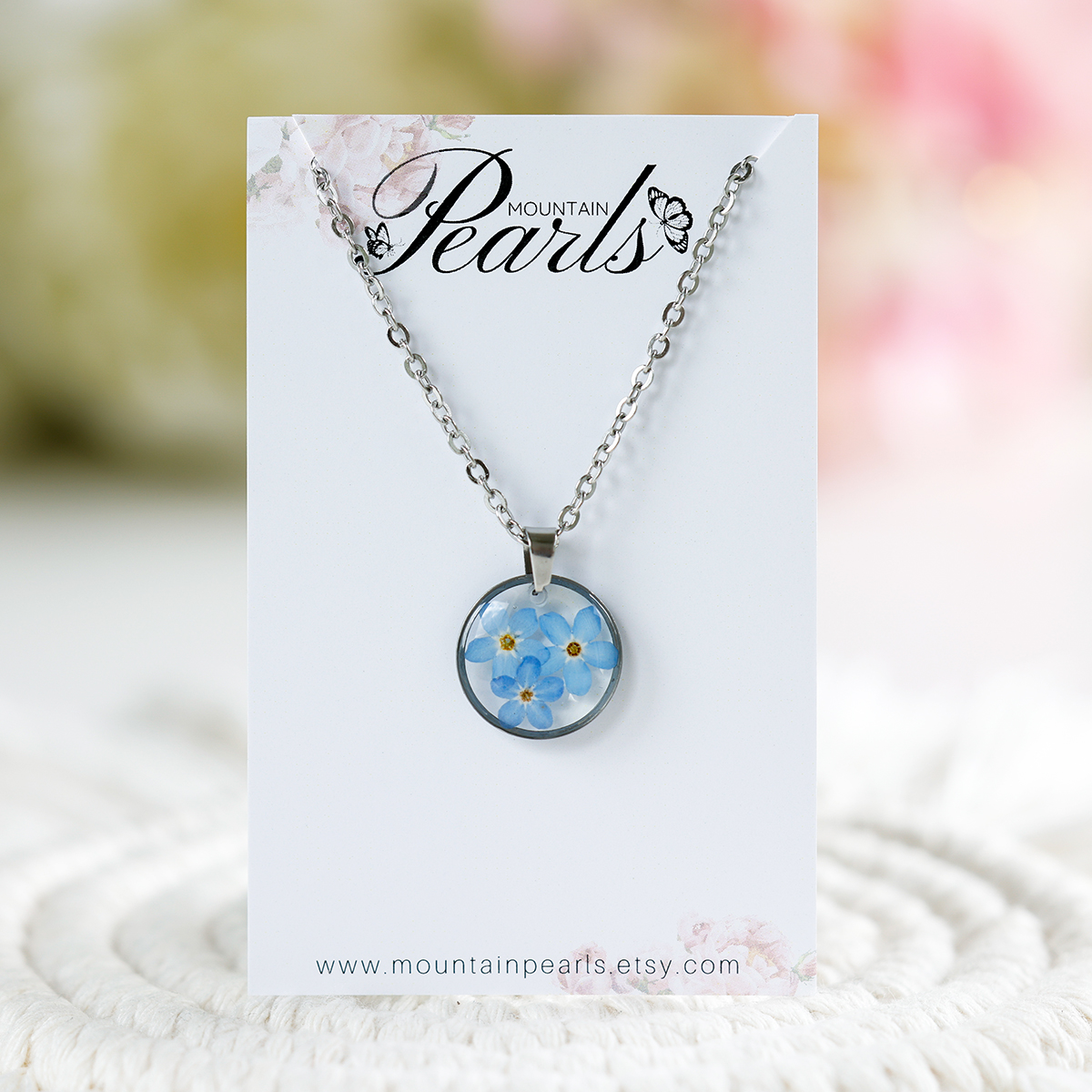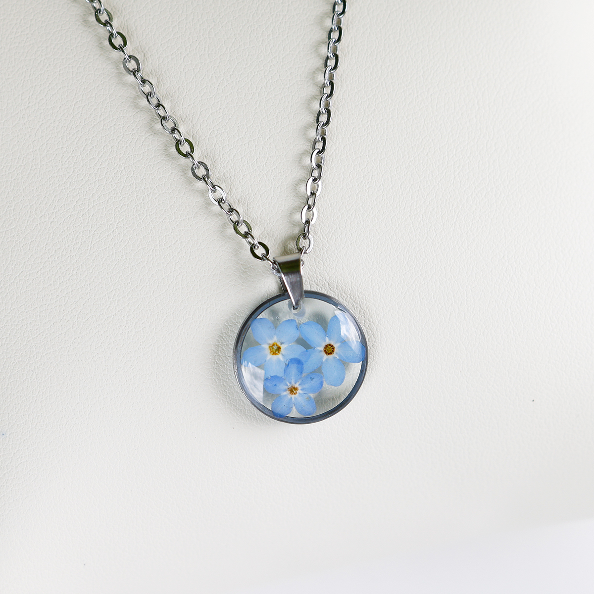 Nežna ogrlica z modrimi spominčicami, ročno nabranimi in za vedno ohranjenimi v prozorni smoli. Cvetki so nežno razporejeni v okroglem srebrnem obesku, ki s svojo preprostostjo poudari njihovo naravno lepoto. Vsak kos je unikaten – nobena ogrlica ni povsem enaka.