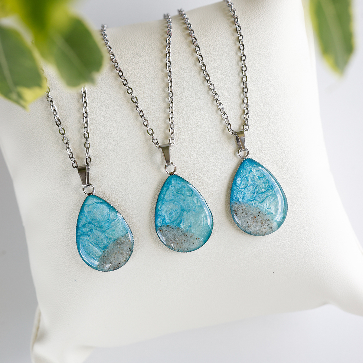 Ogrlica iz kolekcije Soča, ujeta v nežne svetlo modre odtenke in dopolnjena z drobnim peskom iz reke Soče.