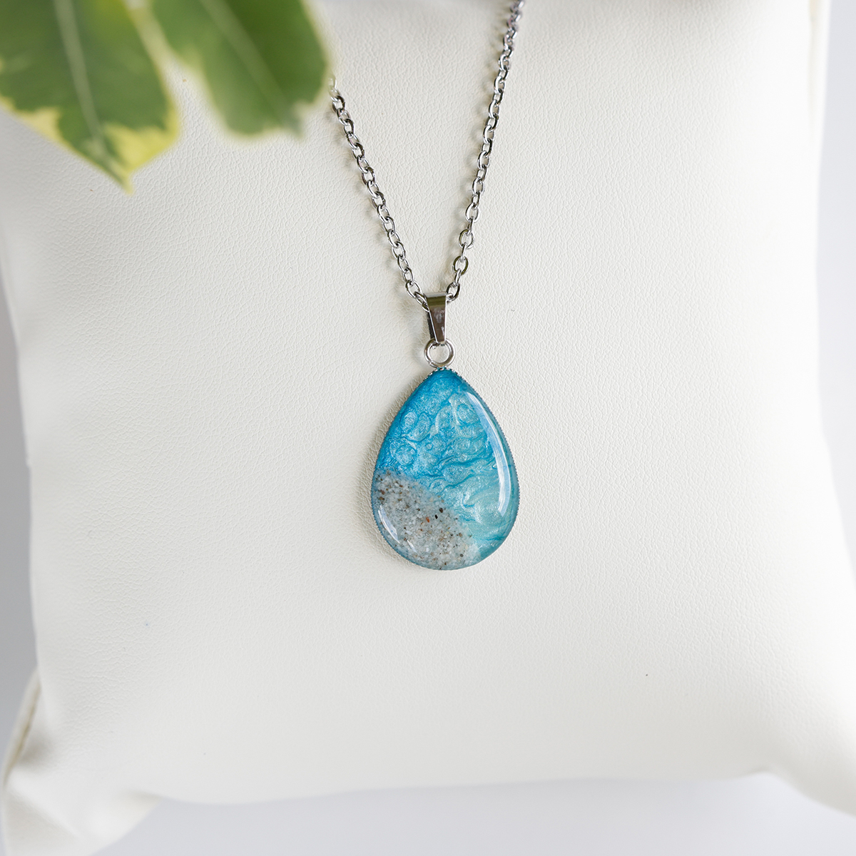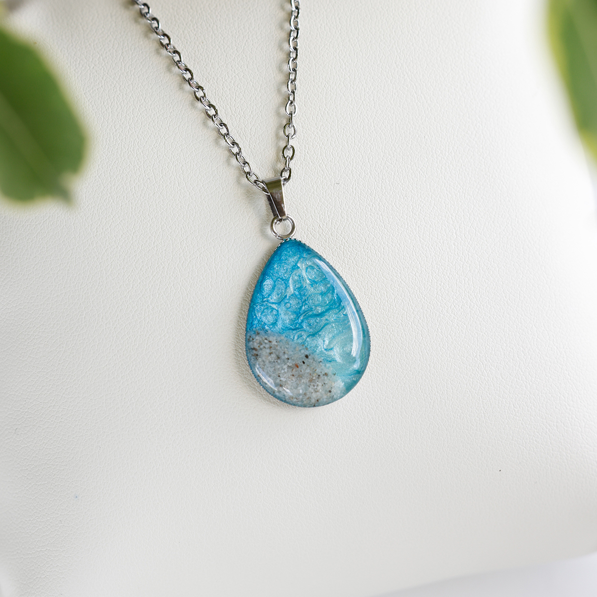 Ogrlica Soča s kapljičastim obeskom v svetlo modri barvi in drobnim peskom iz reke Soče. Ročno izdelana, z verižico dolžine 46 cm.