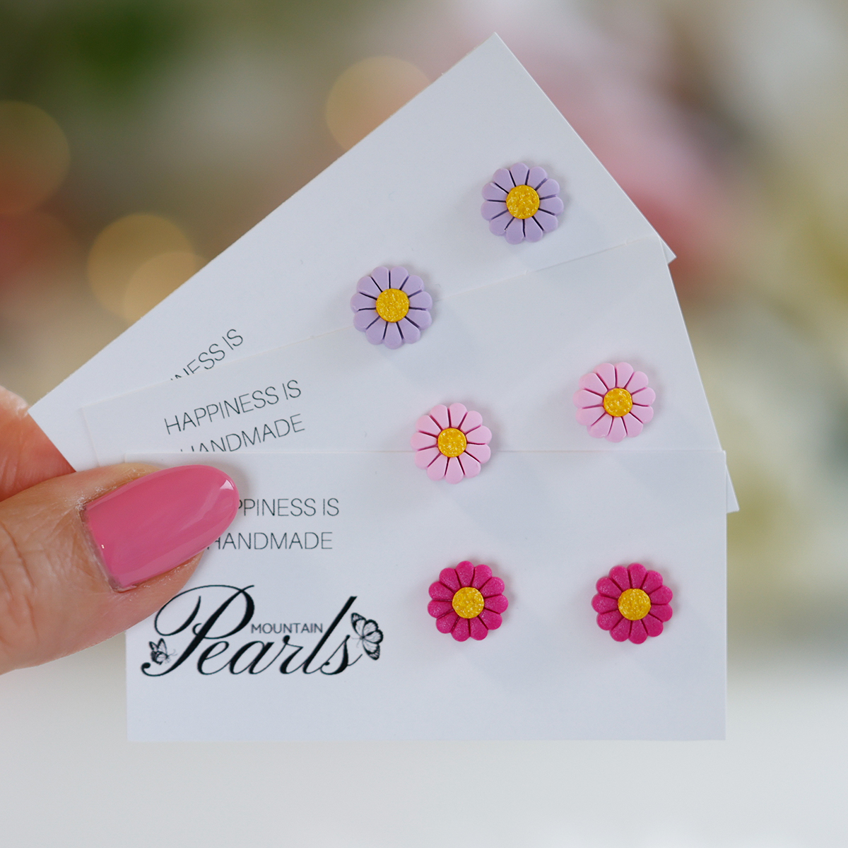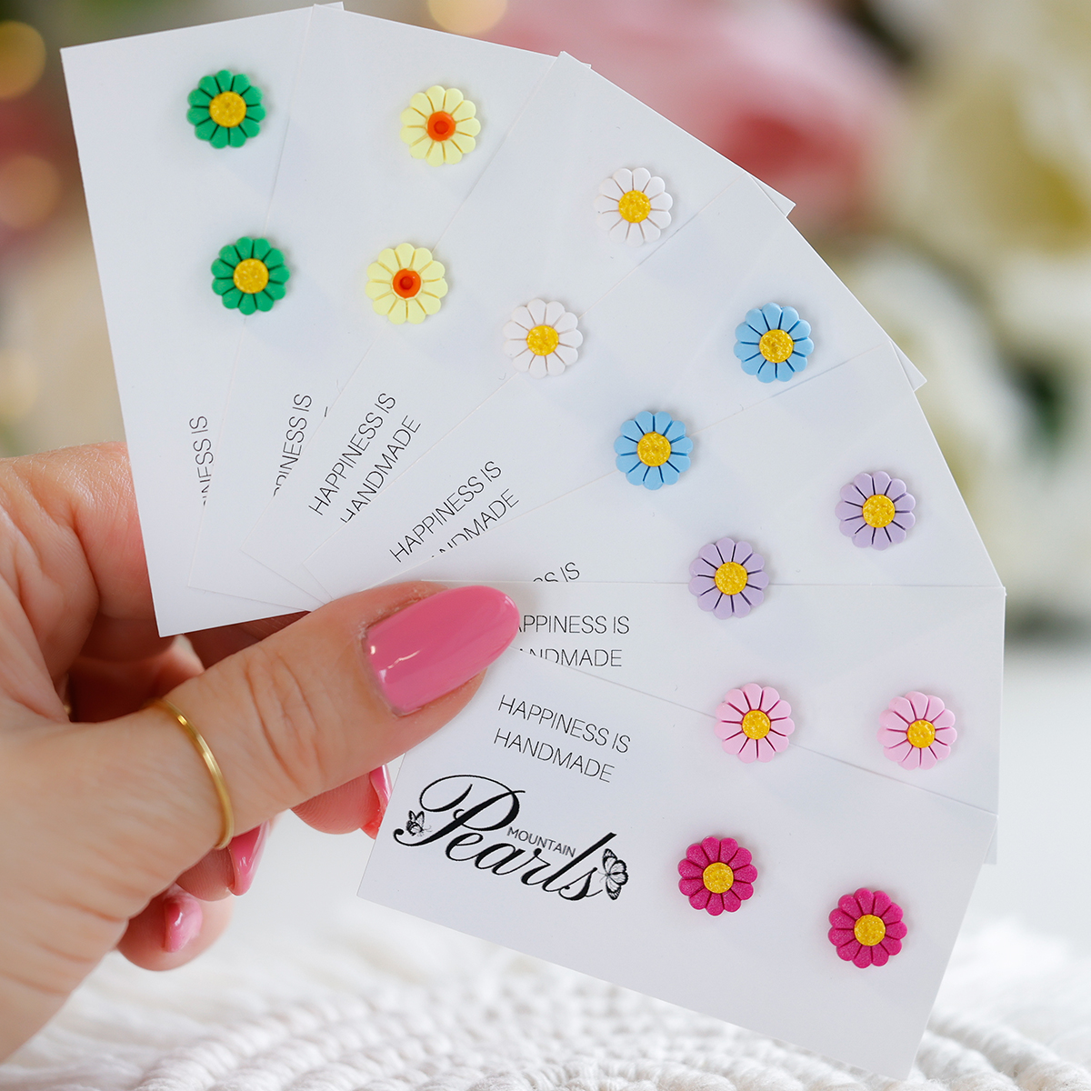 Ročno izdelani mini uhani v obliki rožic iz polimerne gline. Na voljo v različnih pomladnih barvah. Osnova iz nerjavečega jekla.