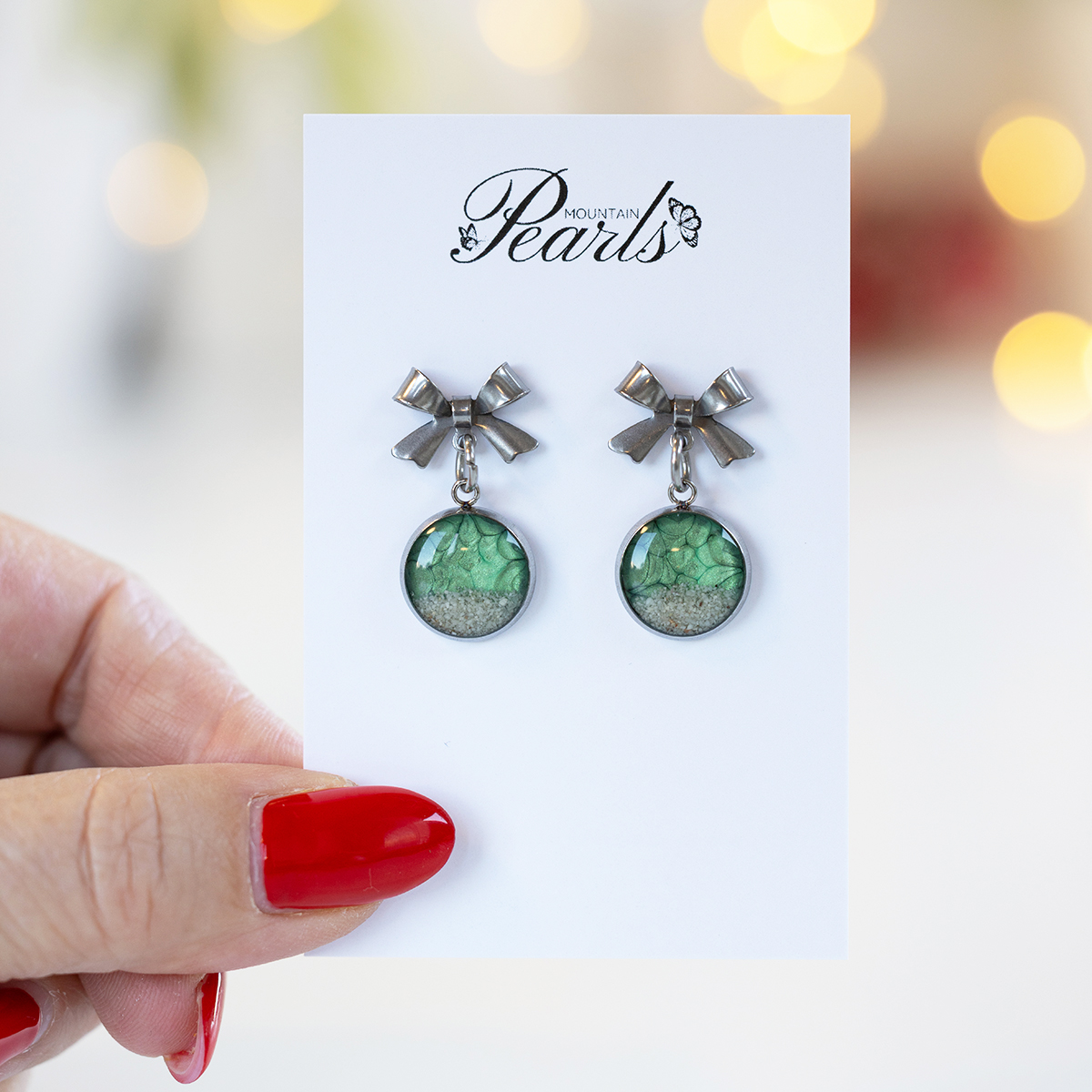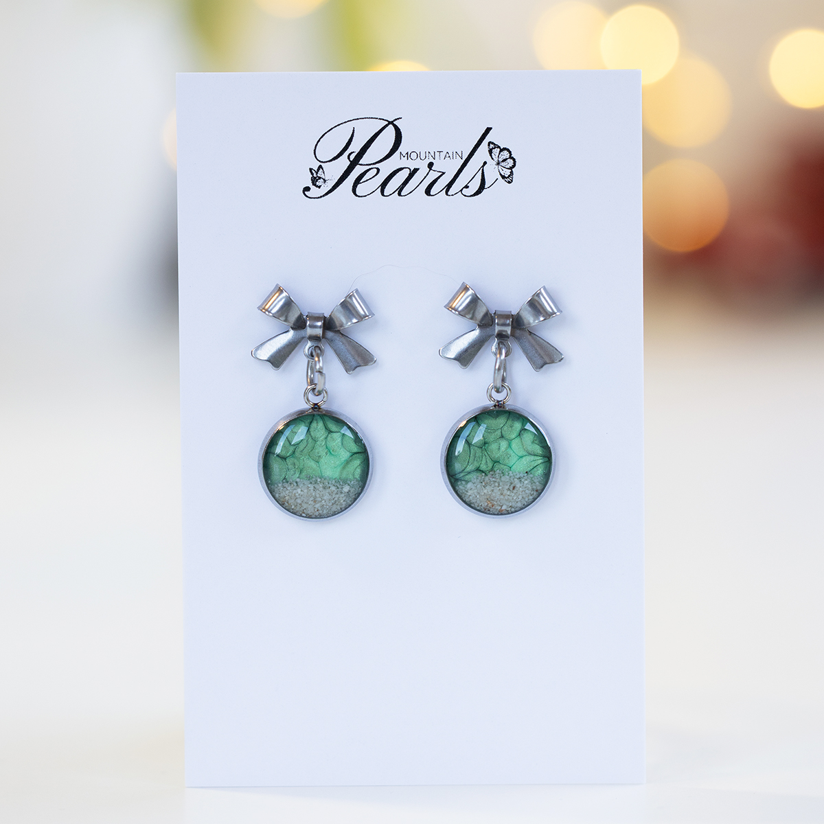 Unikatni praznični zeleni viseči uhani s peskom reke Soče in kovinsko mašnico v srebrni barvi. Elegantni, lahki in popolni kot darilo.