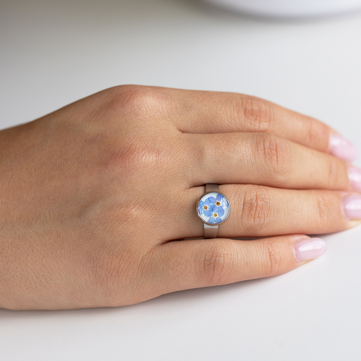 Nastavljiv prstan iz nerjavečega jekla s posušenimi cvetovi spominčic, zalitimi s smolo – nežen kos za ljubiteljice narave.