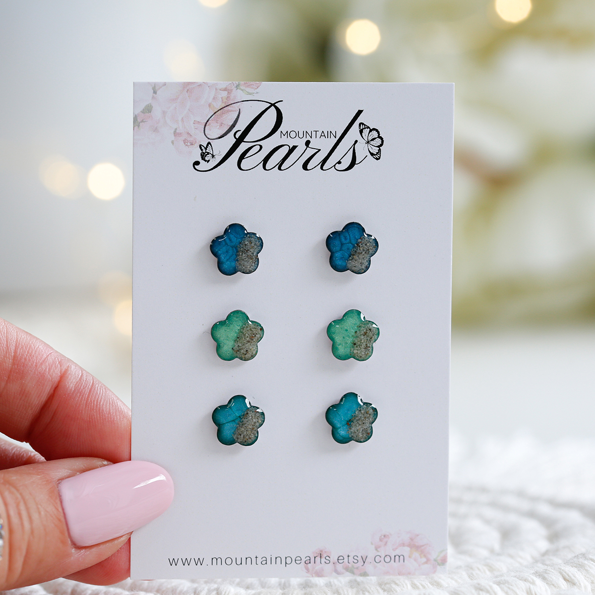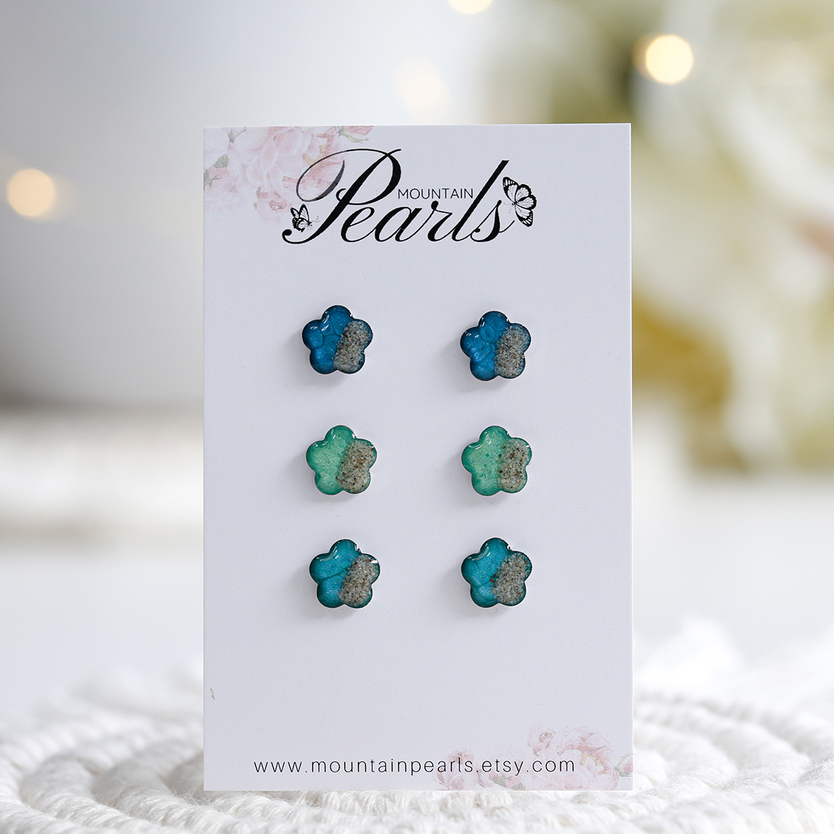 Unikatni neviseči uhani Mountain Pearls. V obliki rožic, več barv. Kolekcija Soča.