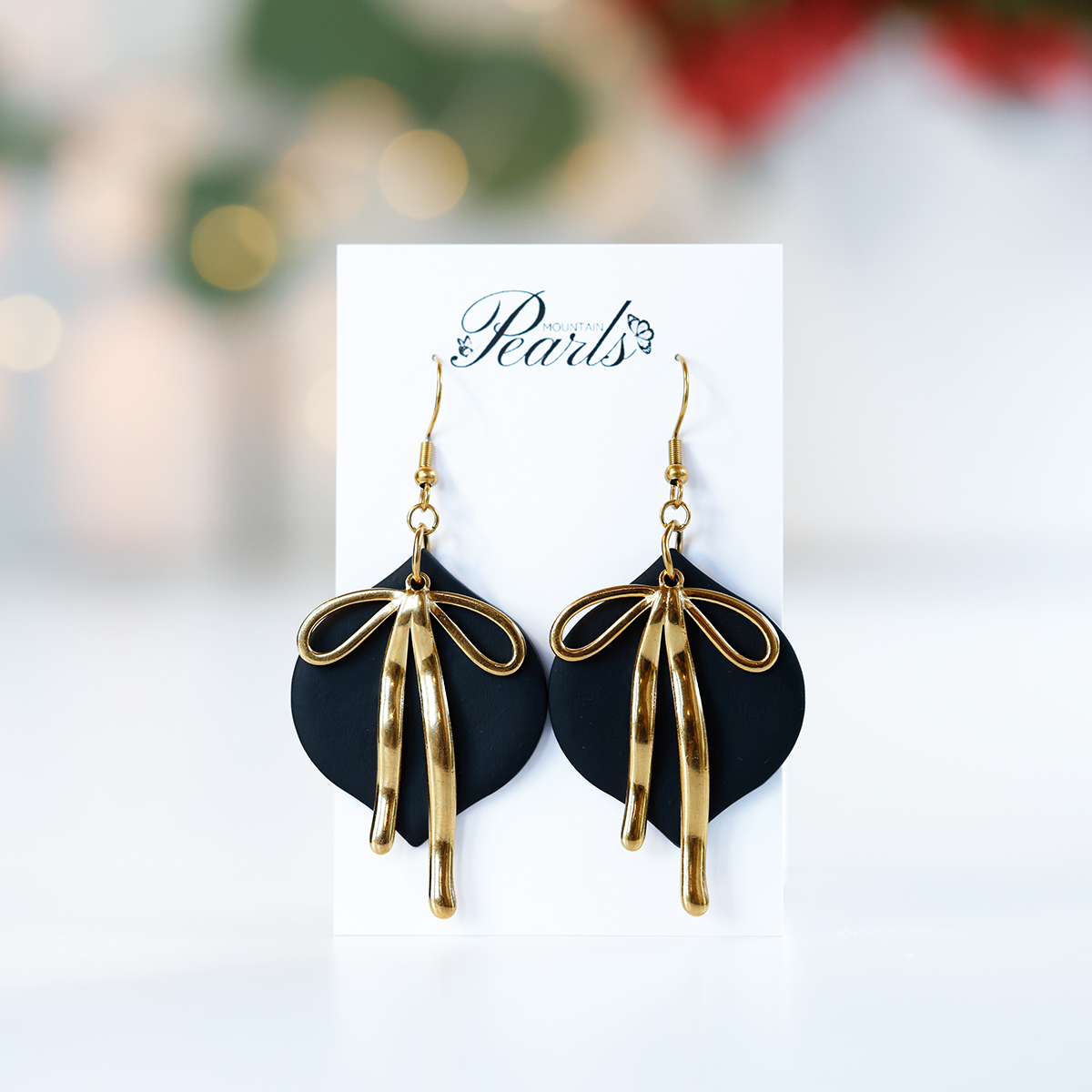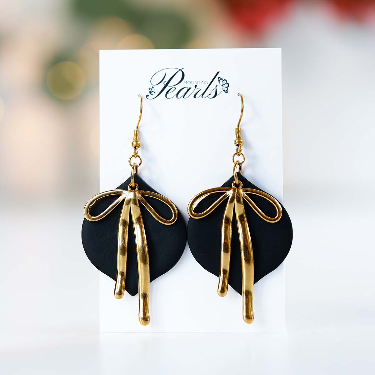 Elegantni viseči črni uhani z zlato mašnico – popolni za praznične večere, posebne priložnosti ali kot unikatno darilo.
