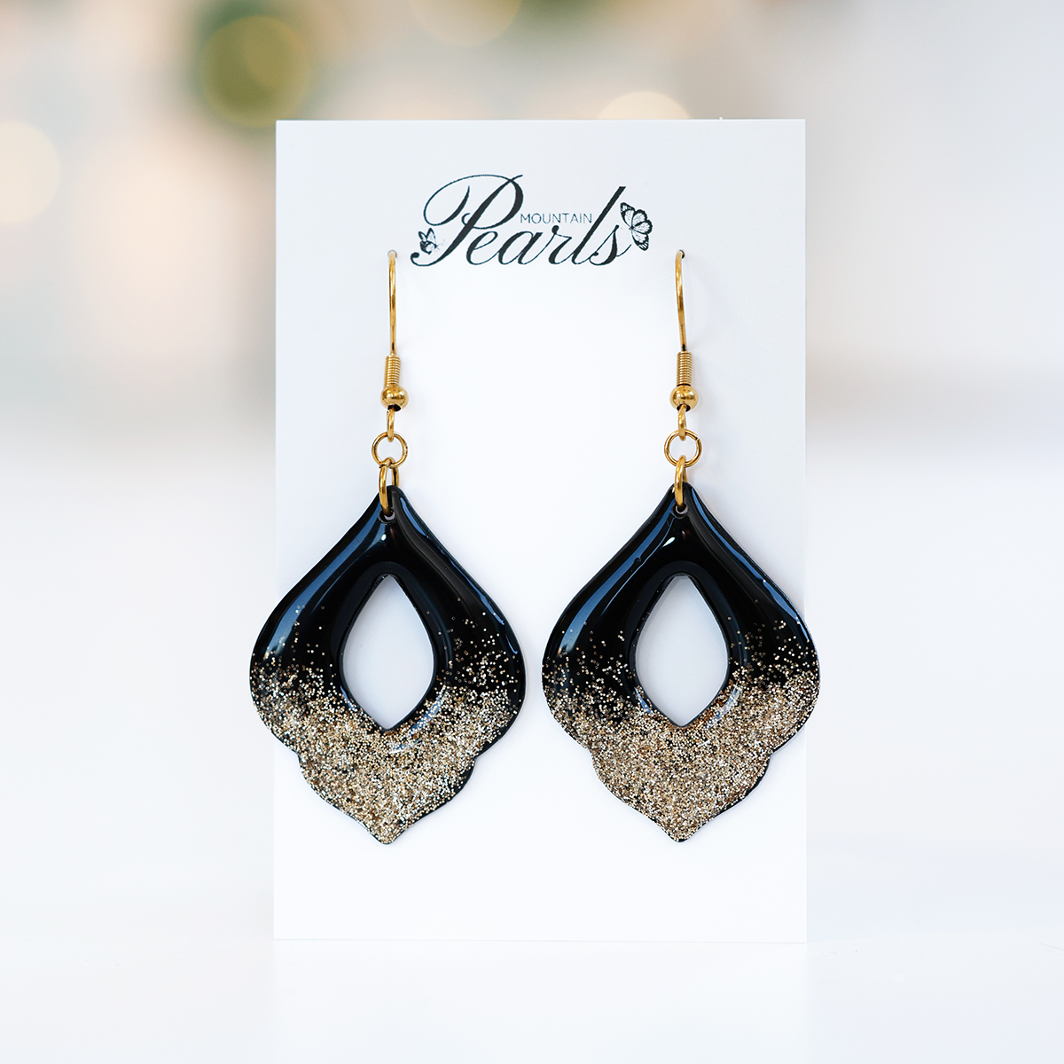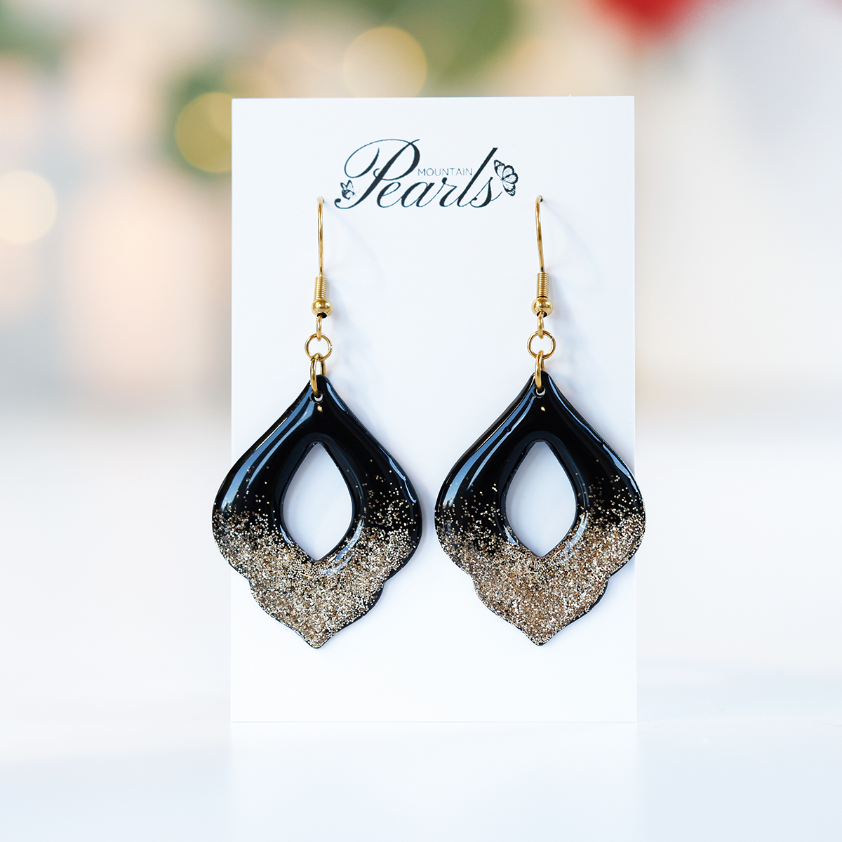 Viseči črno-zlati uhani z bleščicami so ustvarjeni za trenutke, ko želiš svojemu videzu dodati toplino zlatega sijaja in praznični lesk. Temna, elegantna osnova se nežno preliva v iskriv zlat bleščeč poudarek, ki ujame svetlobo in ob vsakem premiku zažari v toplih, bogatih tonih.