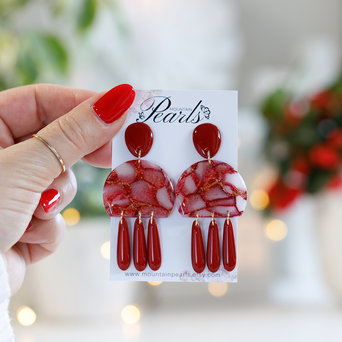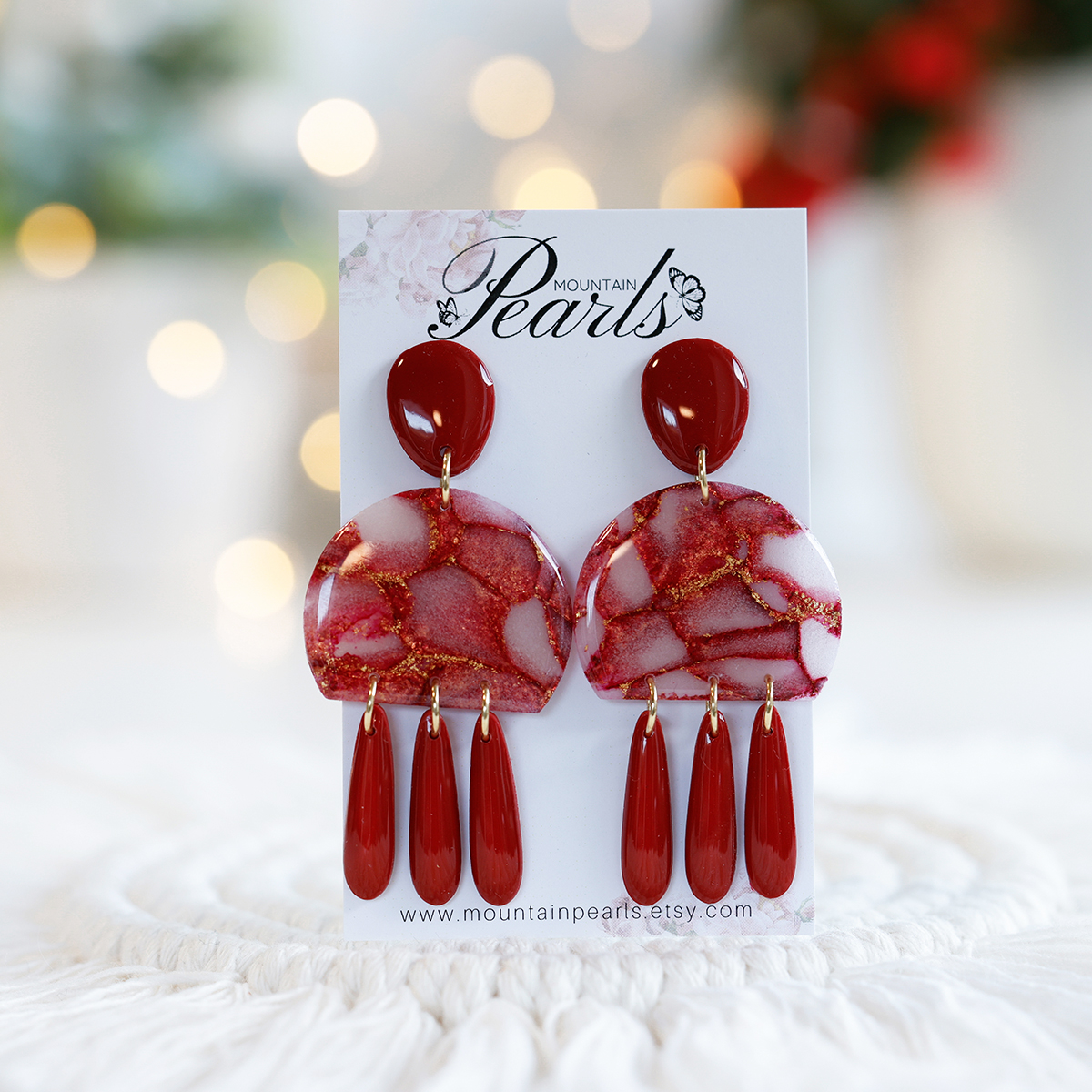 Unikatni rdeči viseči uhani z zlatimi detajli, izdelani iz polimerne gline in preliti z umetno smolo. Elegantni, lahki in popolni kot praznično ali božično darilo.