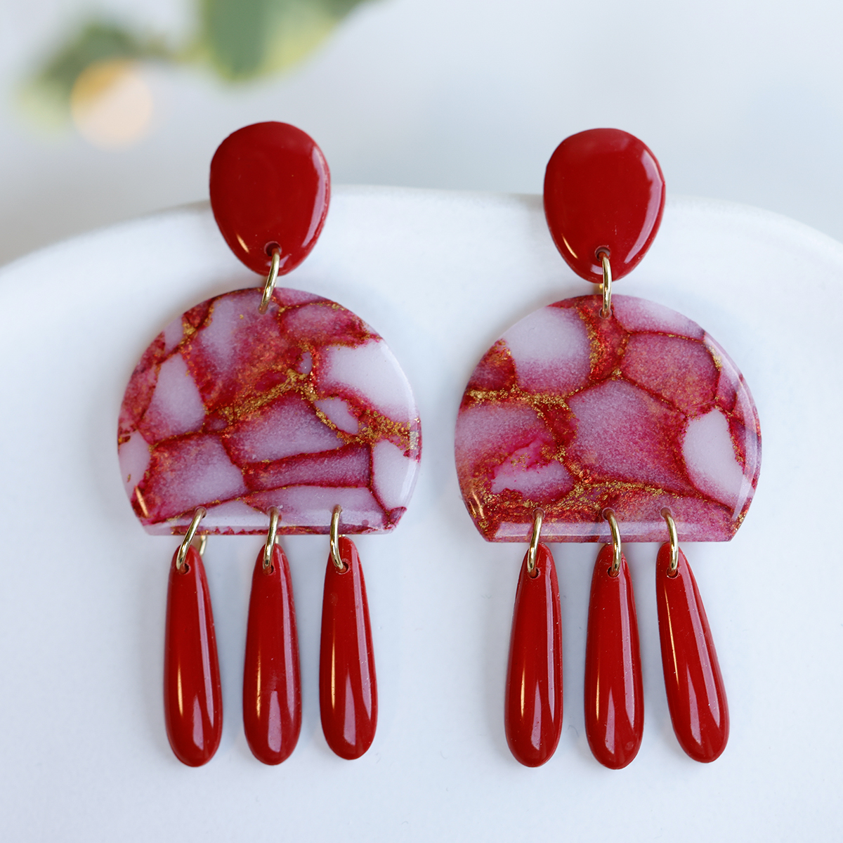 Rdeči viseči uhani v toplih, živahnih tonih in prefinjenih zlatih linijah izžarevajo energijo, veselje in praznično eleganco. Izdelani so iz kakovostne polimerne gline ter preliti z umetno smolo, ki poudari njihove barvne prehode in doda čudovit lesk.