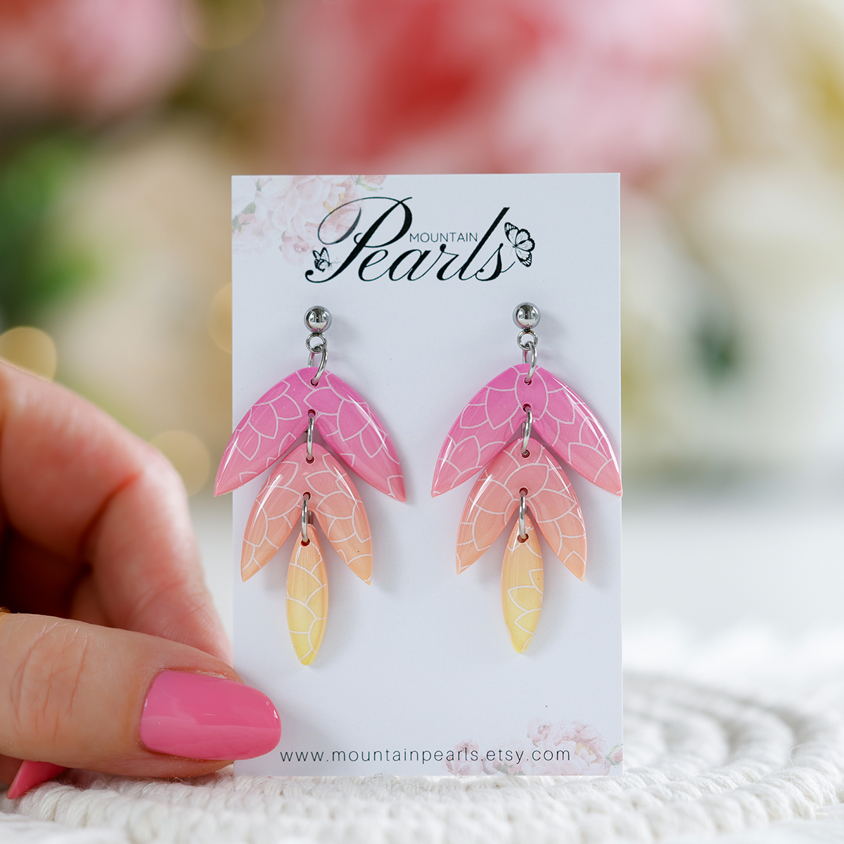 Ročno izdelani viseči uhani iz polimerne gline v roza in rumeni barvi Mountain Pearls. Elegantni in lahkotni, primerni za vsako priložnost.