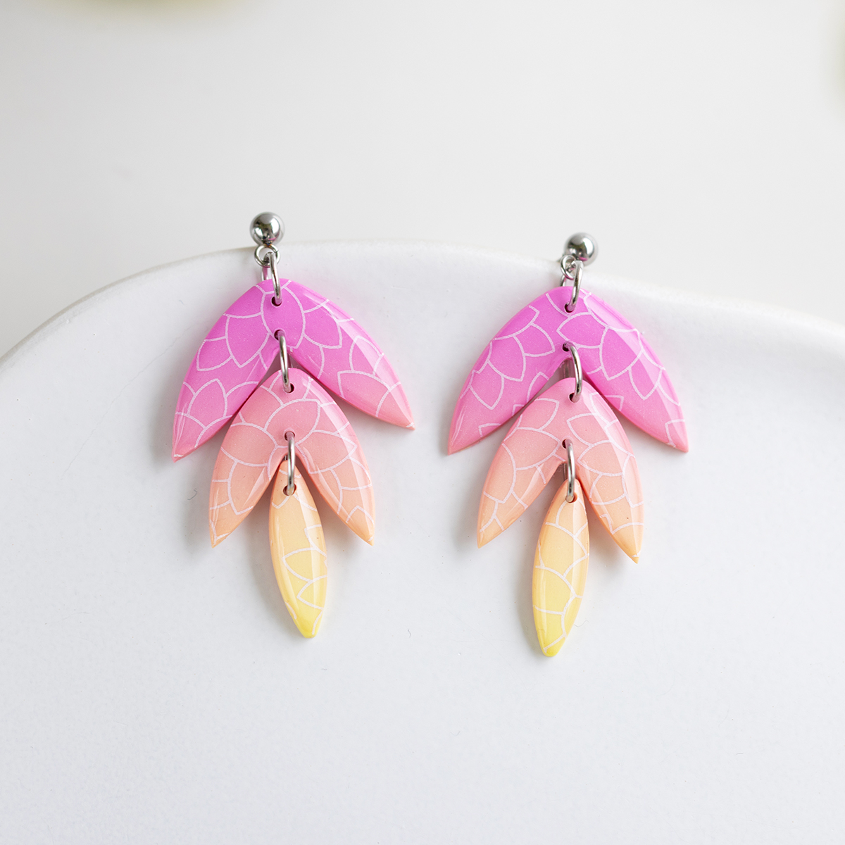 Ti viseči uhani so ročno izdelani iz kakovostne polimerne gline in dopolnjeni z nežnim cvetličnim vzorcem. So izjemno lahki, z osnovo iz nerjavečega jekla.