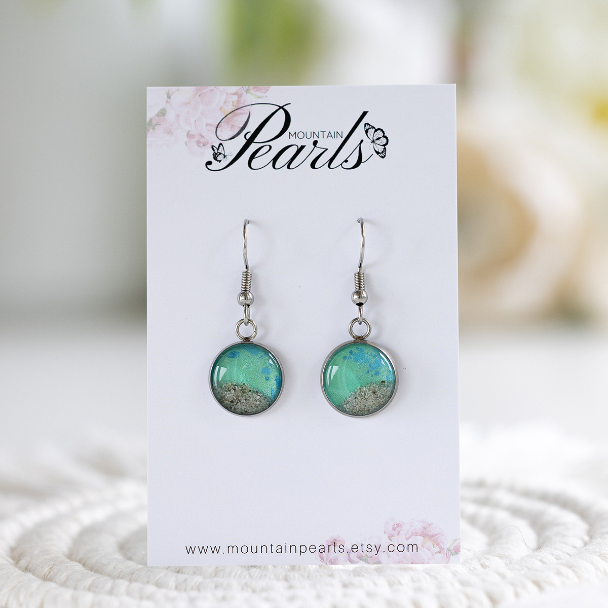 Viseči uhani Soča v zelenih tonih z modrim pridihom in s peskom iz reke. Ročno izdelani, lahkotni in unikatni.