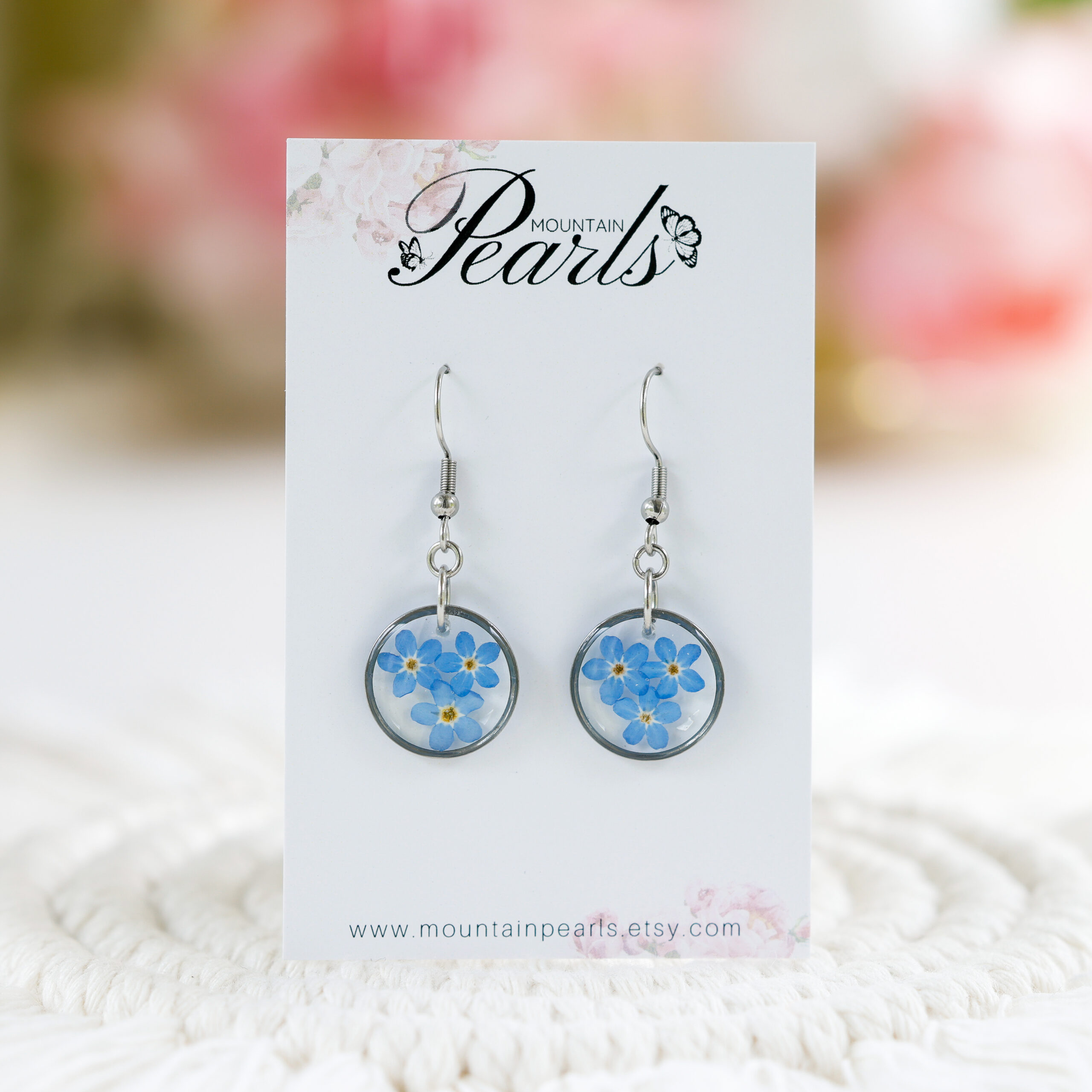 Viseči uhani z modrimi spominčicami v jekleni srebrni okrogli osnovi. Nežni, ročno izdelani in unikatni – kot lep spomin v obliki nakita.