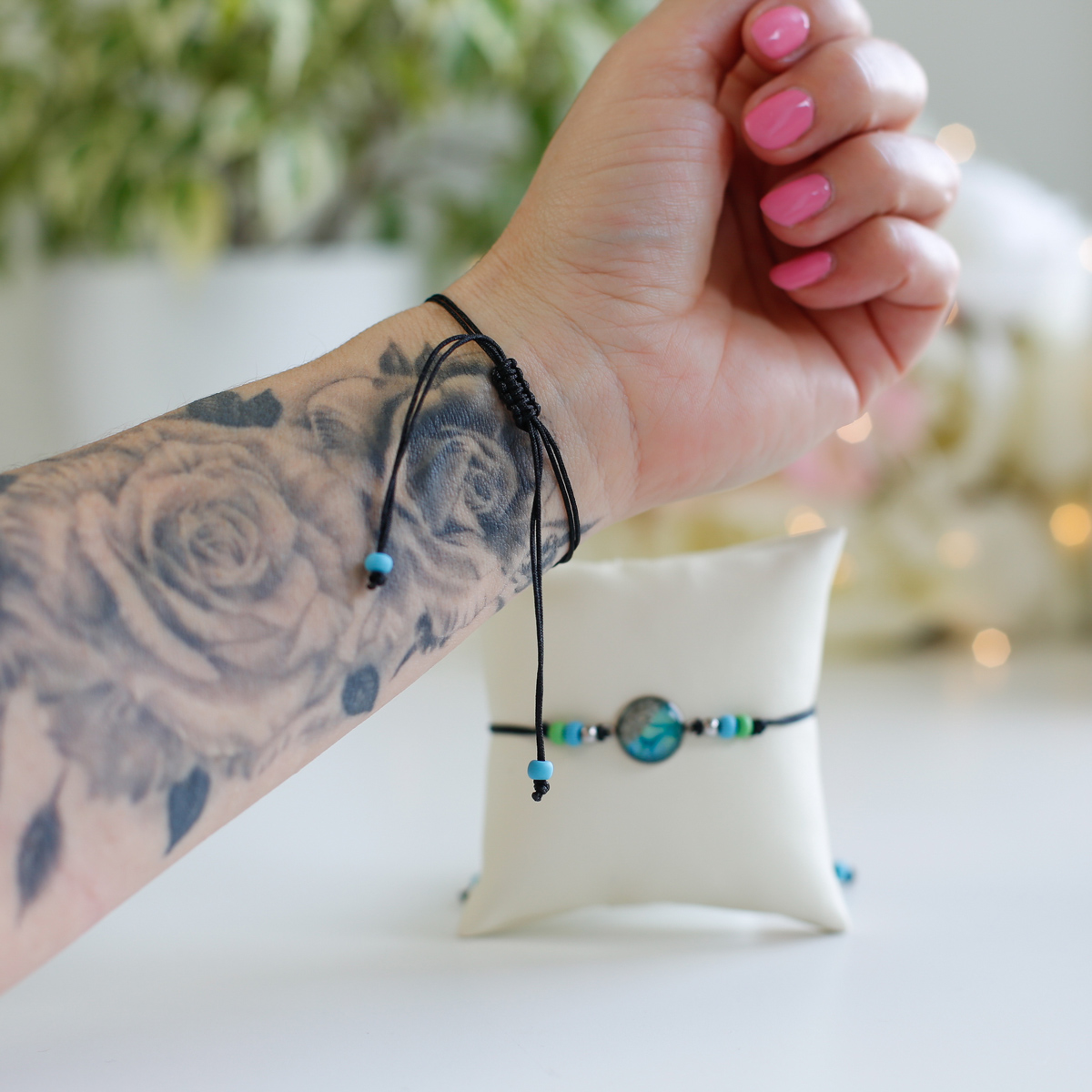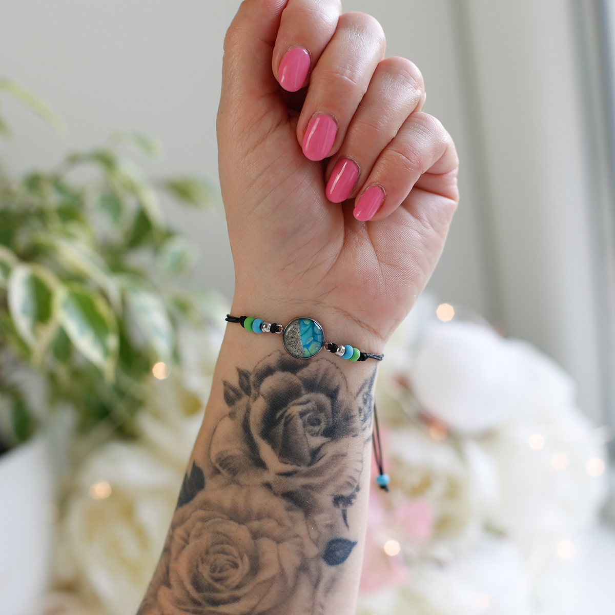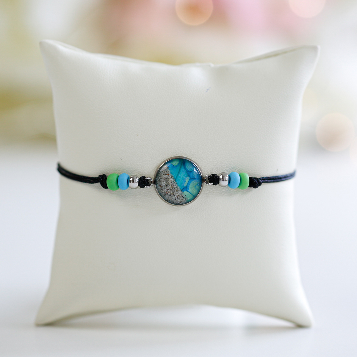 Unikatna zapestnica Mountain Pearls z medalijonom na sintetični vrvici. Kolekcija Soča.